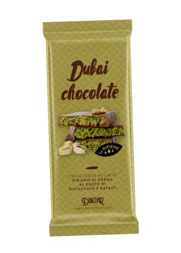 Prémium minőségű pisztáciával és kataifi ízű krémmel töltött tejcsokoládé tábla. Gluténmentes termék.