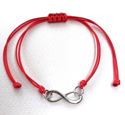 Piros zsinórból, egyedi, állítható méretű, kézzel csomózott Végtelen szimbólummal diszített Barátságkarkötő- Ideális ajándékötlet különböző alkalmakra.