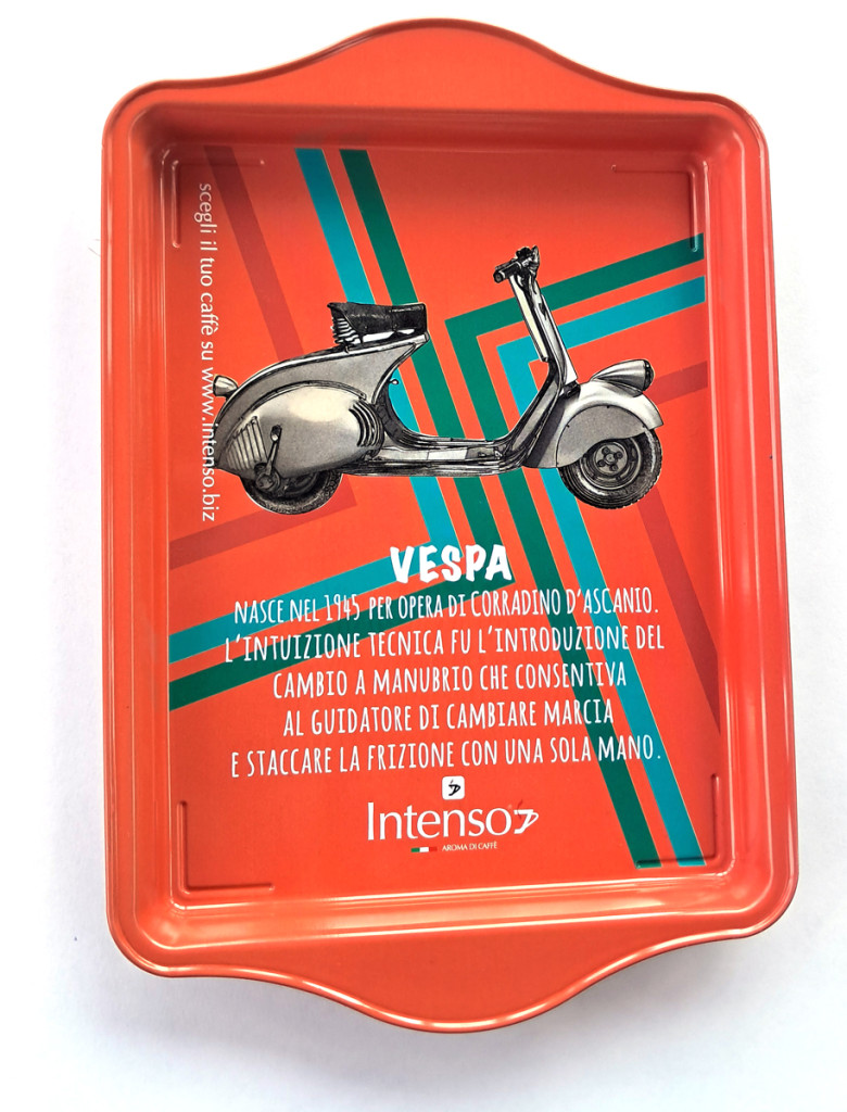 Kávézz elegánsan az Intenso Vespa fémtálcával. Ideális kettő espresso vagy cappuccino csészéhez. Mérete: 14,5×21,5 cm